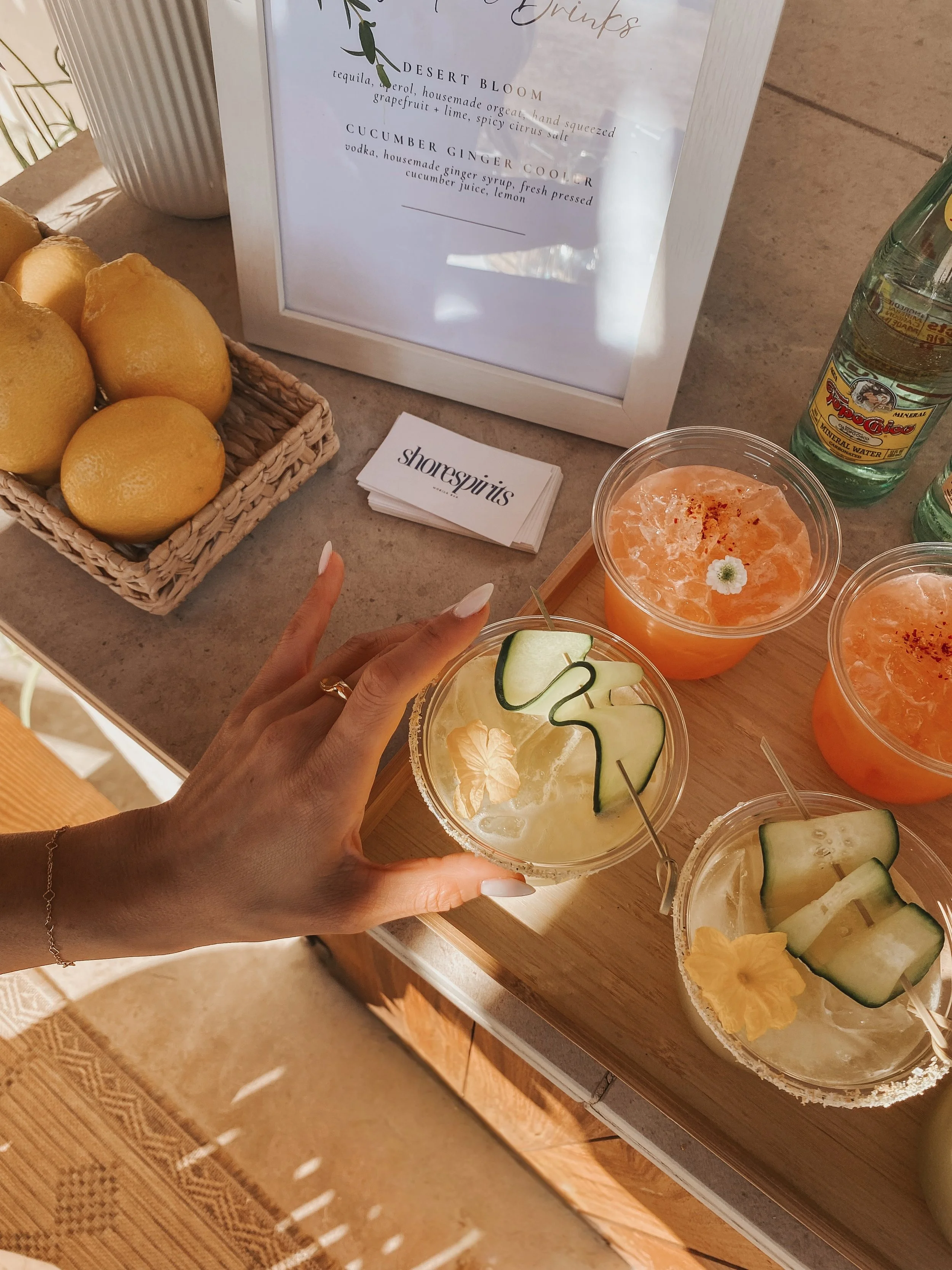 Your Shore Spirits experience comes with fresh mixers, house-made garnishes, thoughtful bar design, cups, ice, and attentive service. We handle the details so your event feels effortless and beautiful executed.